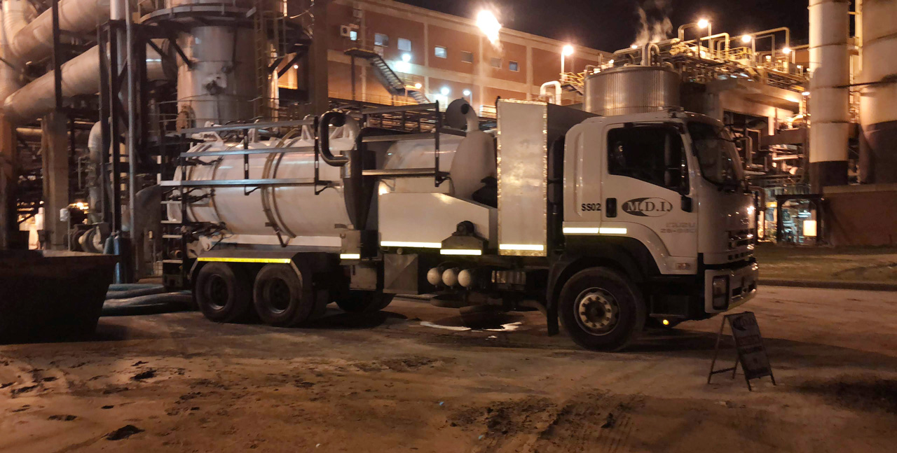 The workings of a vacuum truck include a pump that provides suction to the vacuum hose through an intake valve. As the hose begins sucking, the waste is transferred to the primary chamber of the truck. A secondary chamber is available as the primary chamber fills to avoid waste coming in contact with the vacuum truck’s pump. MDI’s trucks have a back hatch that opens and allows the collected waste to be dumped.